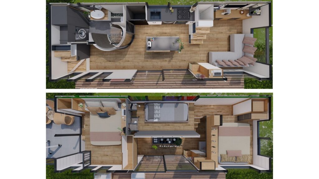 Olmoti 90XL, tiny house modelleri arasında 3+1 plan sunarak geniş aile yaşamına hitap eden nadir seçeneklerden biridir. Kompakt ölçülerine rağmen sunduğu oda sayısı ve dengeli planlamasıyla klasik ev düzenini tiny house konseptiyle birleştirir.