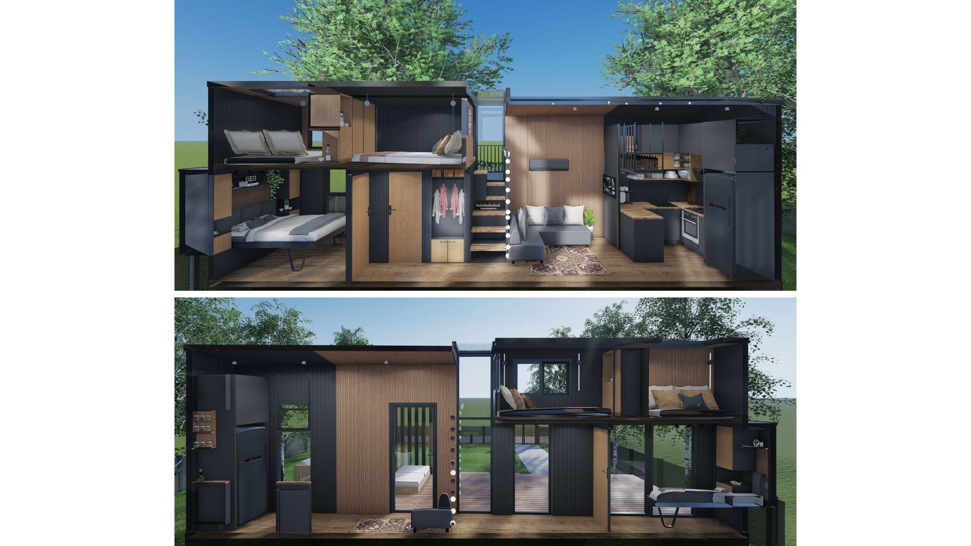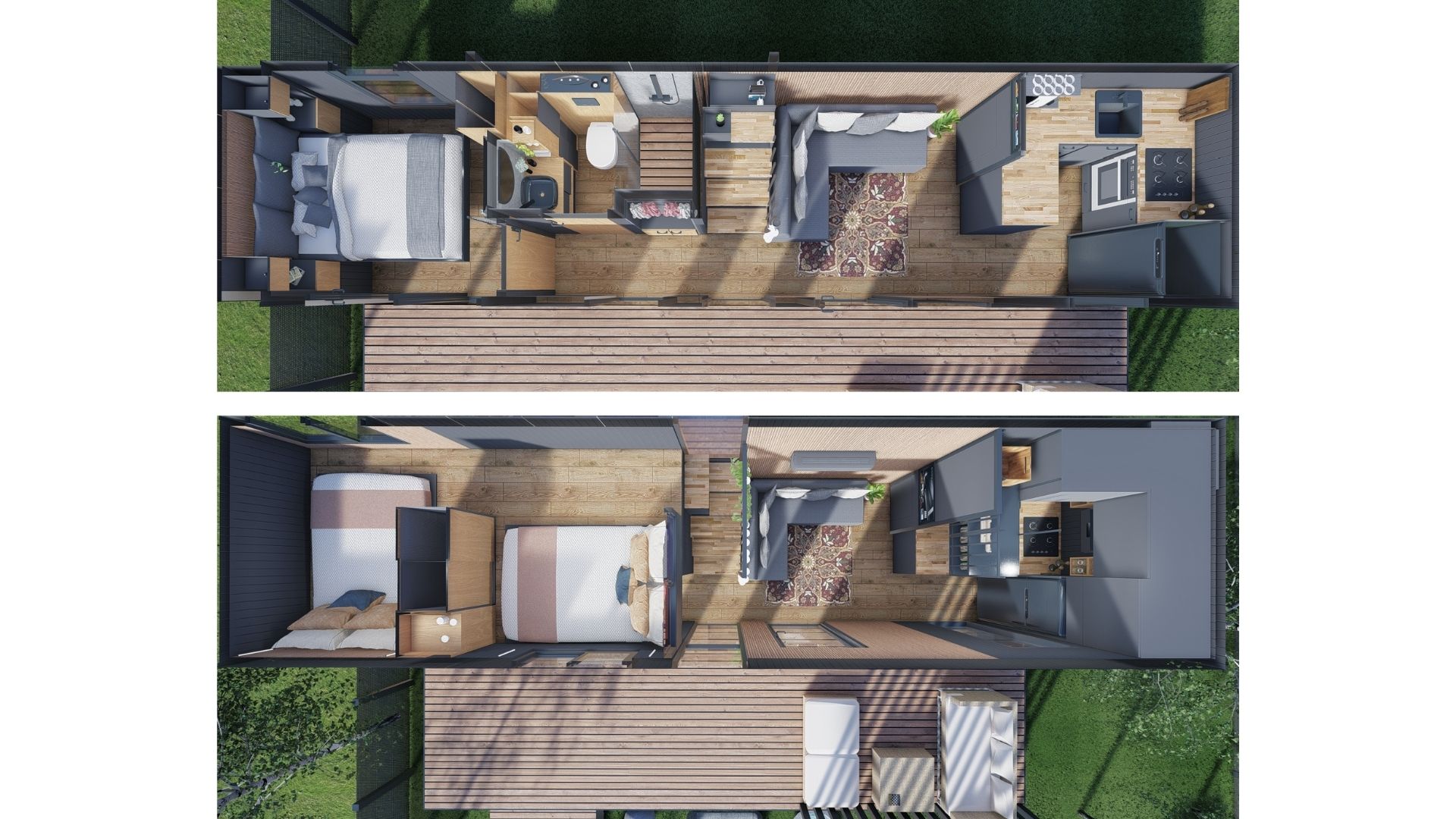 Olovo 100XL, tiny house ölçülerinde 3+1 plan avantajı sunarak geniş aile kullanımı için özel olarak geliştirilmiş güçlü bir modeldir. Üç ayrı yatak alanı, geniş salon hacmi ve dengeli yerleşimi sayesinde kalabalık kullanımlarda dahi konforlu bir yaşam sağlar.